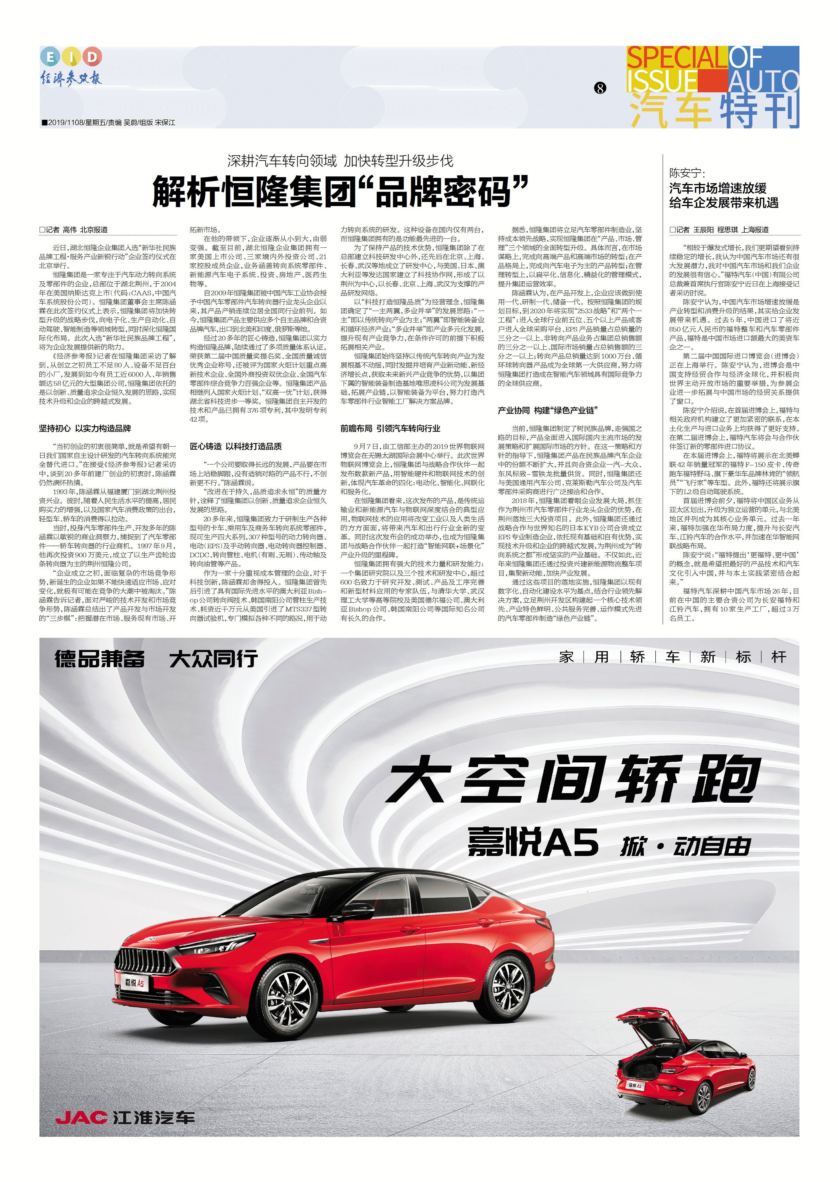恒隆集團是一家專注于汽車動力轉(zhuǎn)向系統(tǒng)及零部件的企業(yè),總部位于湖北荊州,于2004年在美國納斯達(dá)克上市(代碼:CAAS,中國汽車系統(tǒng)股份公司)。恒隆集團董事會主席陳涵霖在此次簽約儀式上表示,恒隆集團將加快轉(zhuǎn)型升級的戰(zhàn)略步伐,向電子化、生產(chǎn)自動化、自動駕駛、智能制造等領(lǐng)域轉(zhuǎn)型,同時深化恒隆國際化布局。此次入選“新華社民族品牌工程”,將為企業(yè)發(fā)展提供新的助力。