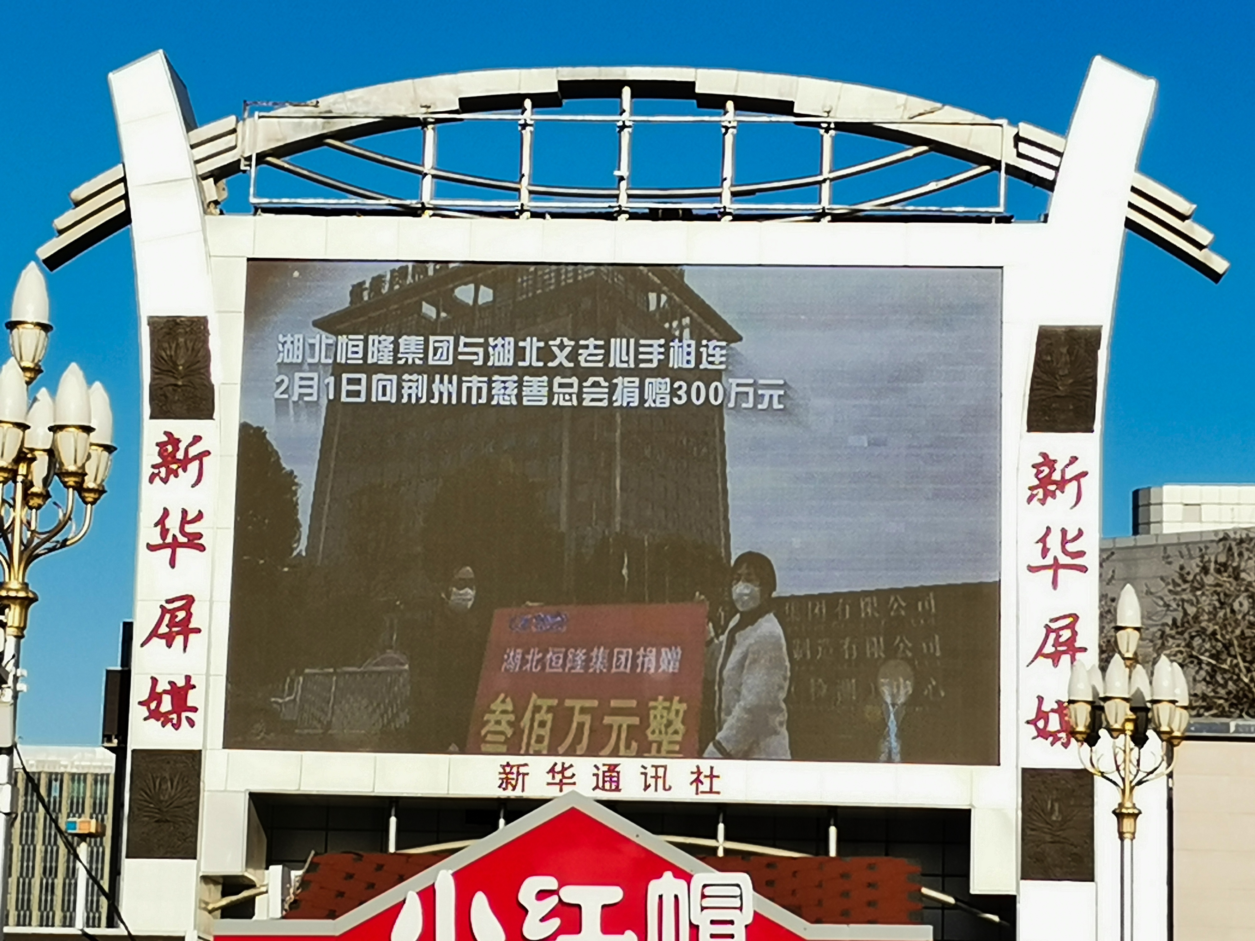 為弘揚眾志成城、齊心抗疫的浩然正氣,宣傳抗疫期間積極履行社會責任的企業,新華社民族品牌工程辦公室專題策劃實施了入選企業公益傳播活動,為湖北恒隆集團制作了公益廣告視頻,從3月16日開始,分別在北京王府井大屏、北京站大屏、杭州浙江人民大會堂大屏、南京弗萊德商場大屏、深圳鼎和大廈大屏、上海金融信息大廈外墻面每天滾動播放到3月22日,3月18開始在上海南京路步行街滾動播放到3月24日。這是對恒隆集團在抗疫期間積極投身抗疫行動、為抗疫提供產品保障的充分肯定,對宣傳恒隆集團、宣傳荊州都將發揮重要的作用。